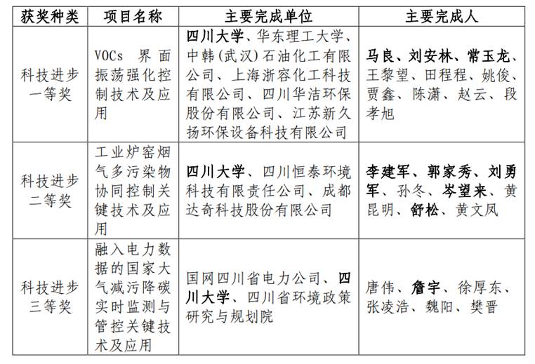 李建军教授牵头,郭家秀教授、刘勇军副教授、岑望来副研究员和舒松助理研究员参与完成的“工业炉窑烟气多污染物协同控制关键技术及应用” 获得四川省科技进步二等奖。该项目针对工业炉窑烟气硫硝尘等主要污染物和汞氟氯等非常规污染物高效协同净化难题,项目团队从材料、设备、工艺出发,经过近10年“产—学—研—用”技术攻关,在工业炉窑烟气多污染物控制理论、核心功能材料、多功能反应器、工艺集成等方面取得重大突破,形成了工业炉窑烟气多污染物协同控制超低排放成套技术与装备,在有色、建材、钢铁、化工等重点行业实现了大规模应用,推动了我国烟气治理技术的进步。