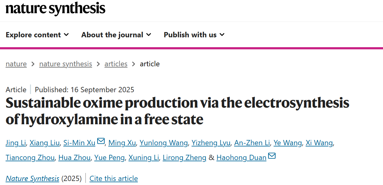 李敬特聘副研究员在可持续低碳催化技术领域取得新进展,相关成果以题为“Sustainable oxime production via the electrosynthesis of hydroxylamine in a free state”发表于《Nature Synthesis》。李敬特聘副研究员为论文第一作者,90win足球比分(中国)官方网站