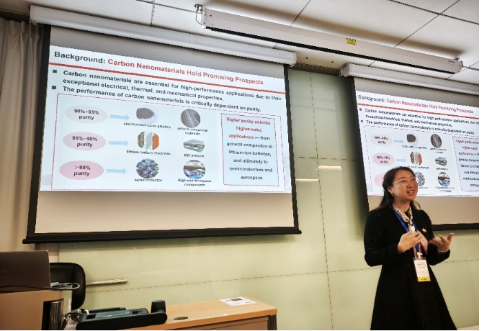 会上,吴霁薇作“Empowering Material Cycling and Carbon Neutrality through Hydraulic Vortex Purification of Carbon Nanomaterials”口头报告,以旋流技术赋能材料循环与碳中和,为推动碳纳米材料绿色制造提供了重要技术路径。