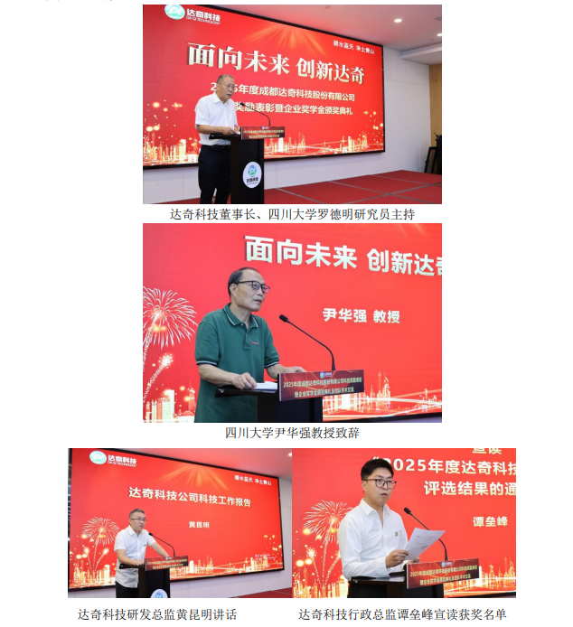 2025年度达奇科技企业奖学金颁奖典礼由达奇科技董事长、四川大学罗德明研究员主持。四川大学尹华强教授在致辞中指出要通过产学研融合构建“研发-验证-应用”全链条体系,铸就低碳科技强国之路。达奇科技研发总监黄昆明介绍达奇科技年度技术成果报告与未来科研发展规划。此环节表彰了在“大气污染治理联合攻关”及“碳中和技术转化”中为企业发展作出突出贡献的在校研究生。